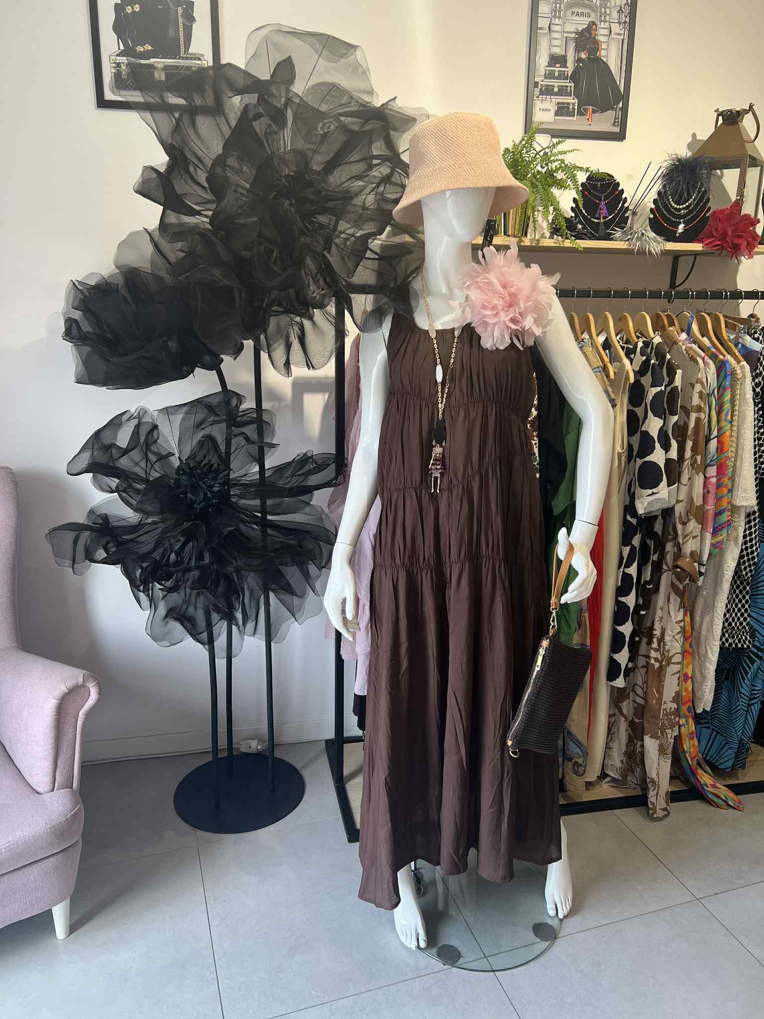 Brązowa sukienka midi na ramiączkach. Ozdobne szwy dodają jej klimatu boho.